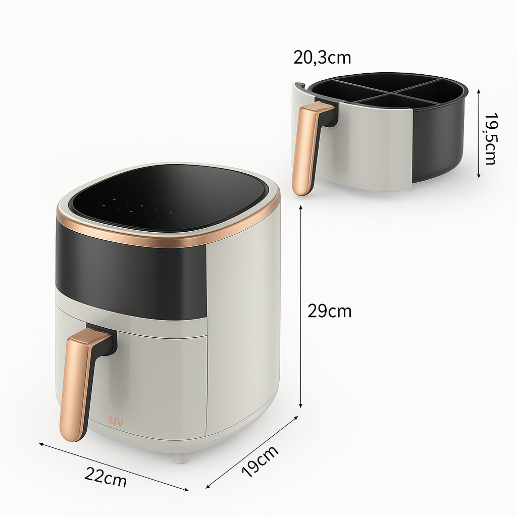 The UV Home Air Fryer combines modern design with advanced cooking technology, making healthy meals easier and faster. Featuring a sleek rose gold handle and a transparent viewing window, it allows you to monitor your food while it cooks. Perfect for roasting, frying, grilling, and baking, this air fryer brings style and convenience to every kitchen.